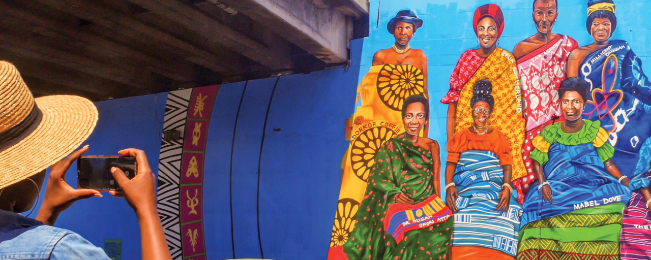 The mural casts its eye over some inspirational sheroes of pre and post-independence Ghana, a dynamic list of leaders whose work dispels the parable that women are primarily focused on social sectors as against areas that drive economies. The women are; Susan Ofori-Atta, Esther Ocloo, Mabel Dove, Theodosia Okoh, Annie Jiagge, Adorkor Coffie, Efua Sutherland, Yaa Asantewaa, Millicent Danquah, and Dedei Ashikishan.